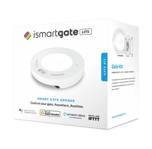 Kit for gate. Includes Wi-Fi controller and waterproof wireless magnetic sensor. ismartgate LITE will remotely open, close and control your gate through HomeKit, Google Home, Samsung SmartThings and iFTTT or with native iOS/Android App. Includes key features such as video, user management compatibility, automatic open/close with GPS location or time (with iFTTT). Only for 1 gate control.